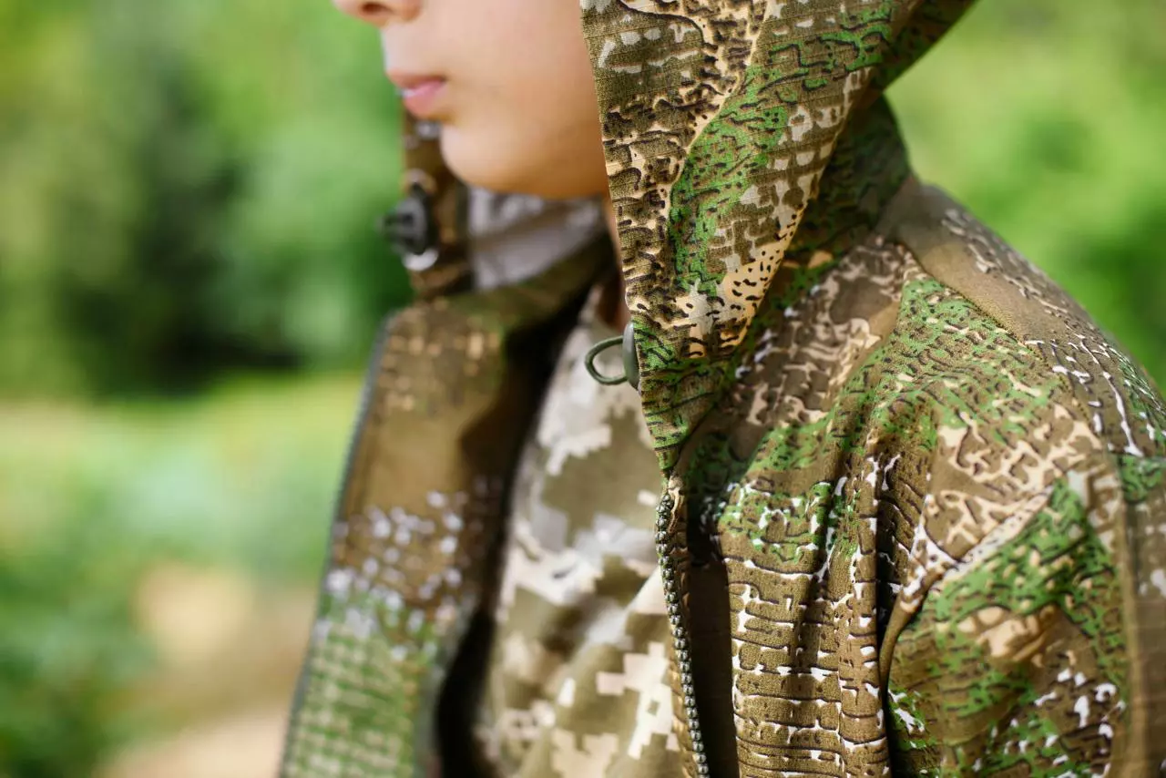 Состоит из камуфляжных брюк и камуфляжной куртки с капюшоном.