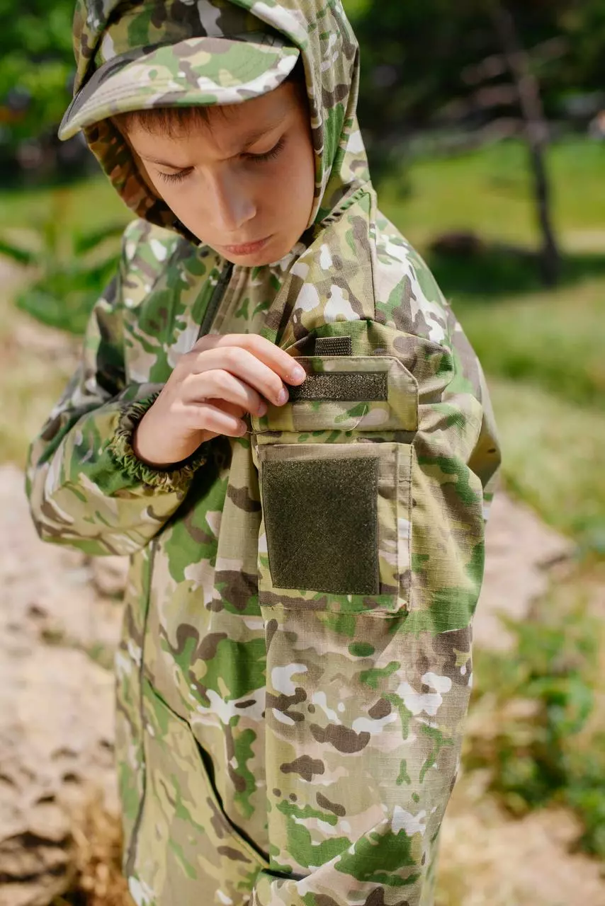 Состоит из камуфляжных брюк и камуфляжной куртки с капюшоном.